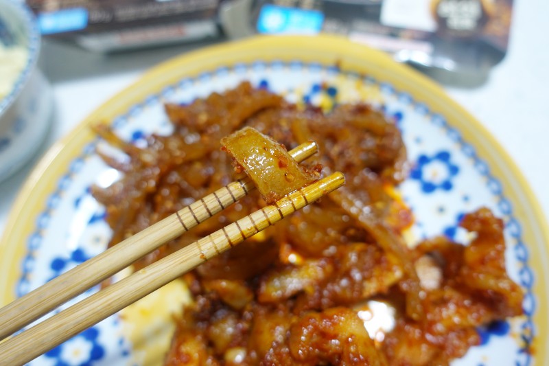 뭔가 이정도로 두툼한 껍데기가 익숙했는데 그래도 양념이랑 쫄깃함이 살아있고 무엇보다 잡내도 하나도 안나요. 주먹밥도 만들어서 먹을까했는데 혼자서 먹기에는 많아서 포기했는데 다음에 혼자 먹으면 닭발이나 껍데기 하나만 먹고 주먹밥도 같이 만들어서 먹고 싶어요. 뭔가 매운거랑은 주먹밥이랑 조합이 넘 좋지요. 청정원 안주야 시리즈 무뼈닭발, 매운껍데기, 직화불막창, 직화곱창 이렇게 먹어봤는데 저의 최애는 바로 직화불막창♥