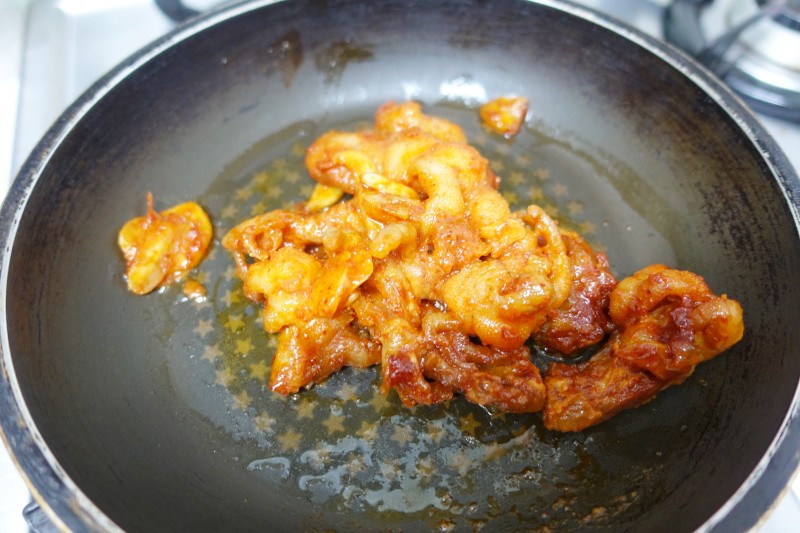 돼지껍데기도 프라이팬에 살짝 볶아줍니다. 노릇노릇 맛있게~
