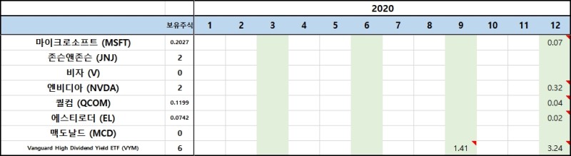 월배당 포트폴리오입니다. 배당월 Q3는 마이크로소프트, 존슨앤드존슨, 비자, 엔비디아, 퀄컴, 에스티로더, 맥도날도, 고배당 ETF로 구성했어요. 하나의 종목에 투자하기에 주가가 부담스럽다면 미니스탁으로 천원단위로 주식을 구매해도 좋고 포트폴리오를 구성하기 귀찮다면 고배당ETF인 VYM ETF를 매수해도 됩니다!