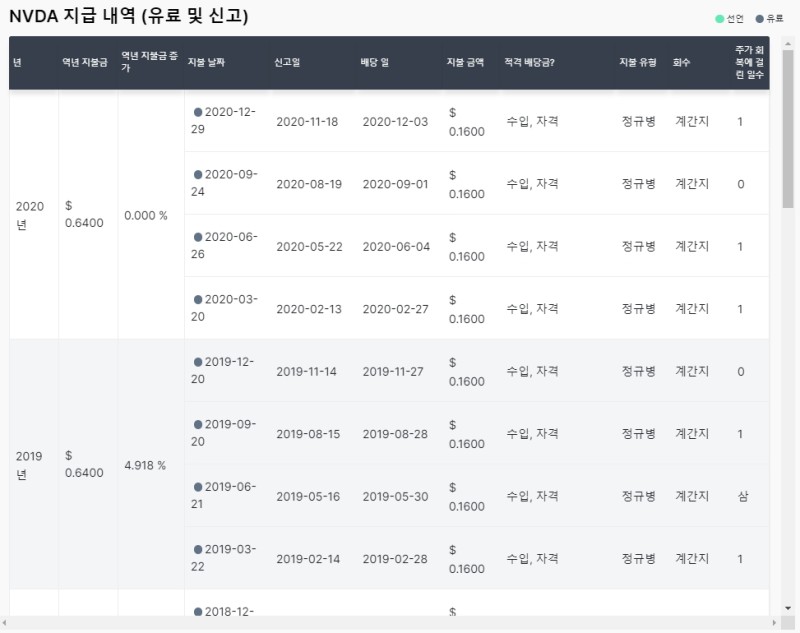 엔비디아 2021년 배당일정이 나왔어요. 2월 24일에 신고가 되었네요. 배당일은 3월 9일이고 지불일은 3월 31일입니다. 그리고 배당금은 0.16달러입니다. 작년보다 신고일이 늦어져서 혹시나 배당금이 늘어나려나 하는 기대감으로 기다렸는데 아쉽지만 배당금은 전년도와 동일한 금액입니다. 뭐 성장주니까 투자를 더 많이 해야할때겠죠? 무튼 올해 3월 31일에도 배당금 나오는거 기대해봐야겠어요. 달랑 2주 보유하고 있지만요! 히히히