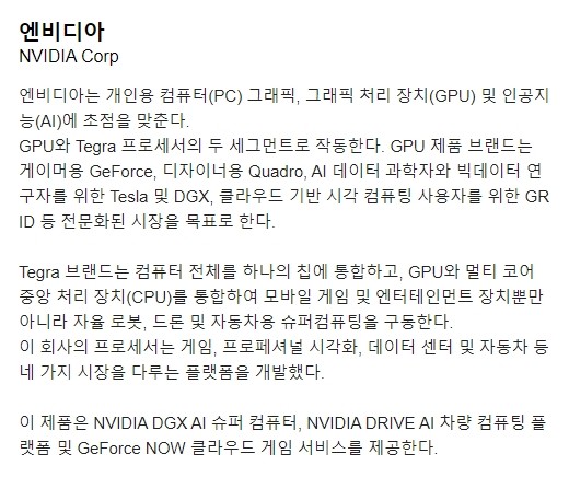 엔비디아는 GPU 그래픽 처리 장치를 전문적으로 설계하는 기업입니다. CPU는 들어봤는데 오 GPU라니 주식을 시작하면서 다양한 용어를 공부하고 있어요. 아는게 역시 힘이죠! 4차산업하면 거론되는 기업 중 하나인 엔비디아입니다. 단순히 게임용 고사양 그래픽 카드 전문 업체로 머물지 않고 인공지능 앱을 실행하는 슈퍼컴퓨터 기술 개발을 이끈다고 해요!