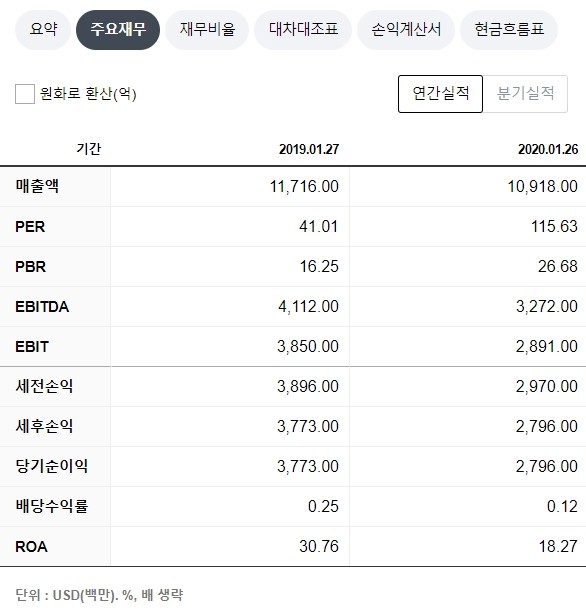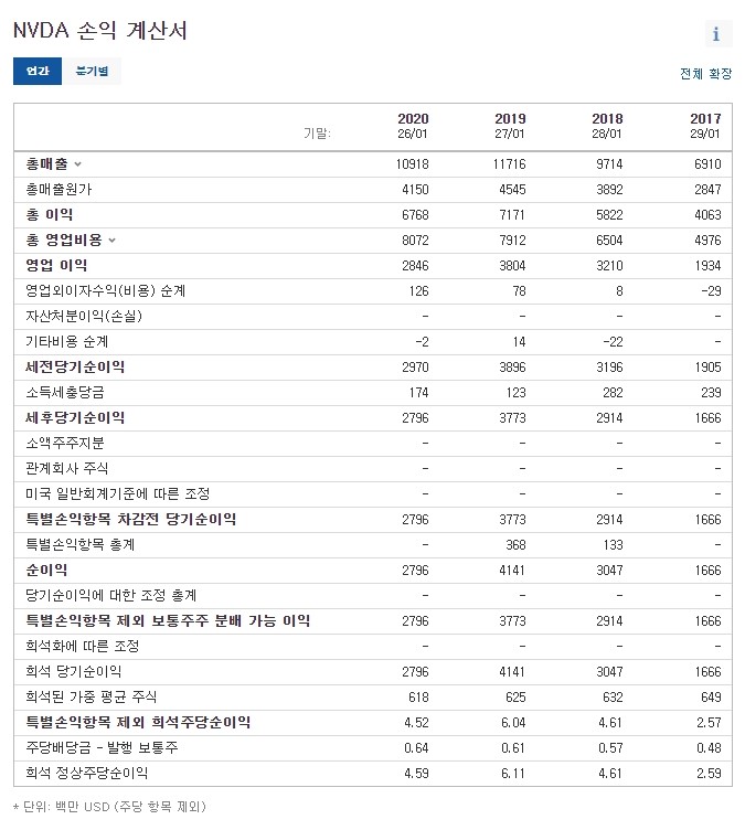 엔비디아 손익 계산서입니다. 총매출, 영업이익, 순이익을 중점적으로 확인합니다. 총매출을 보면 2020년에 감소했더라구요. 그래서 주가가 많이 오르지 못한 것 같아요. 역시 주가는 무조건 실적이 뒷받침이 되야 하는 것 같아요. 2021년 매출은 좋아야하는데!