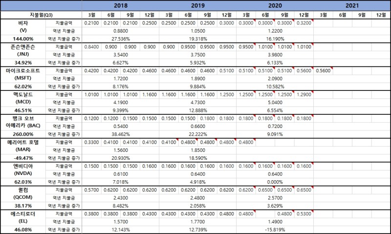 3월, 6월, 9월, 12월 배당을 진행하는 다양한 배당주 리스트입니다. 비자, 존슨앤드존스, 마이크로소프트, 맥도날드, 뱅크 오브 아메리카, 메리어트 호텔, 엔비디아, 퀄컴, 에스티로더 다양한 종목이 있습니다. 배당수익률과 배당금을 꼼꼼하게 체크했어요!