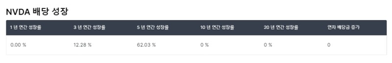 엔비디아 배당 성장률입니다. 1년 연간 성장률 0.00%, 3년 연간 성장률 12.28%, 5년 연간 성장률 62.03% 입니다.