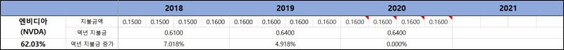 엔비디아 지불금액 보면 2019년부터는 늘리지 않더라구요. 그래도 안주는것보단 낫겠지요. 매출이 더 늘면 배당도 더 늘리겠죠!